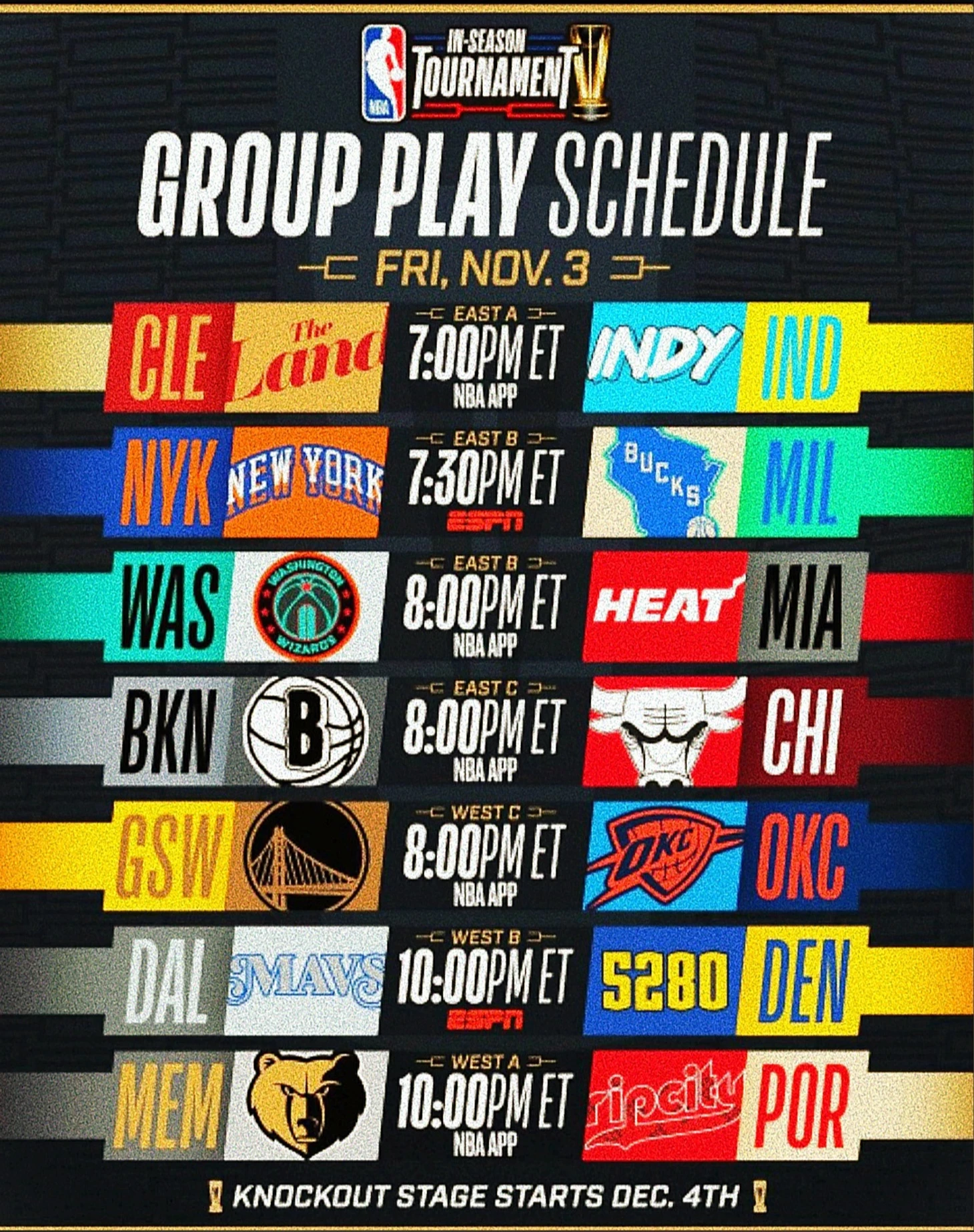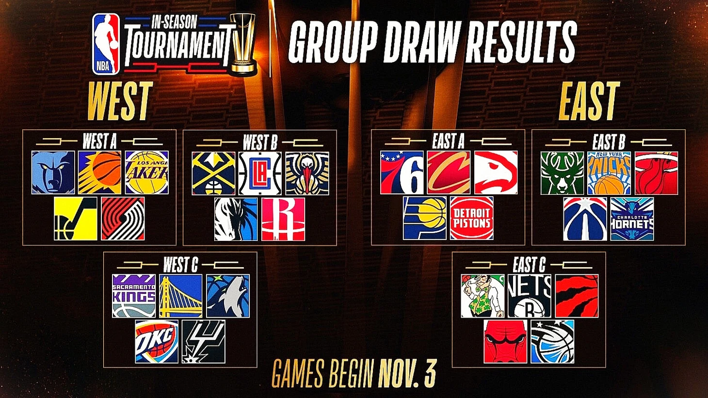 Групповые бега своих лошадок НБА разложила на месяц (по вторникам и пятницам, с 3 по 28 ноября). Начиная с 3 и по 10 декабря включительно расписания в лиге не существует до завершения группового этапа, когда станет понятно, кто эти шесть победителей групп и двое счастливчиков, продолжающих свой мув в город тысячи казино. 4 декабря должны начаться четвертьфиналы. Расписание этих матчей, а также календарь на эту декабрьскую дыру (03.12 - 10.12.2023) в календаре для остальных 22 клубов, делающих вид, что им не сильно-то и хотелось в это Вегас, сформируют сразу вслед за последним вторником ноября (8 заключительных матчей группового этапа внутрисезонного турнира, где Сакраменто и ГСВ поставят последнюю точку стартанут в ночь с 28 на 29 ноября).