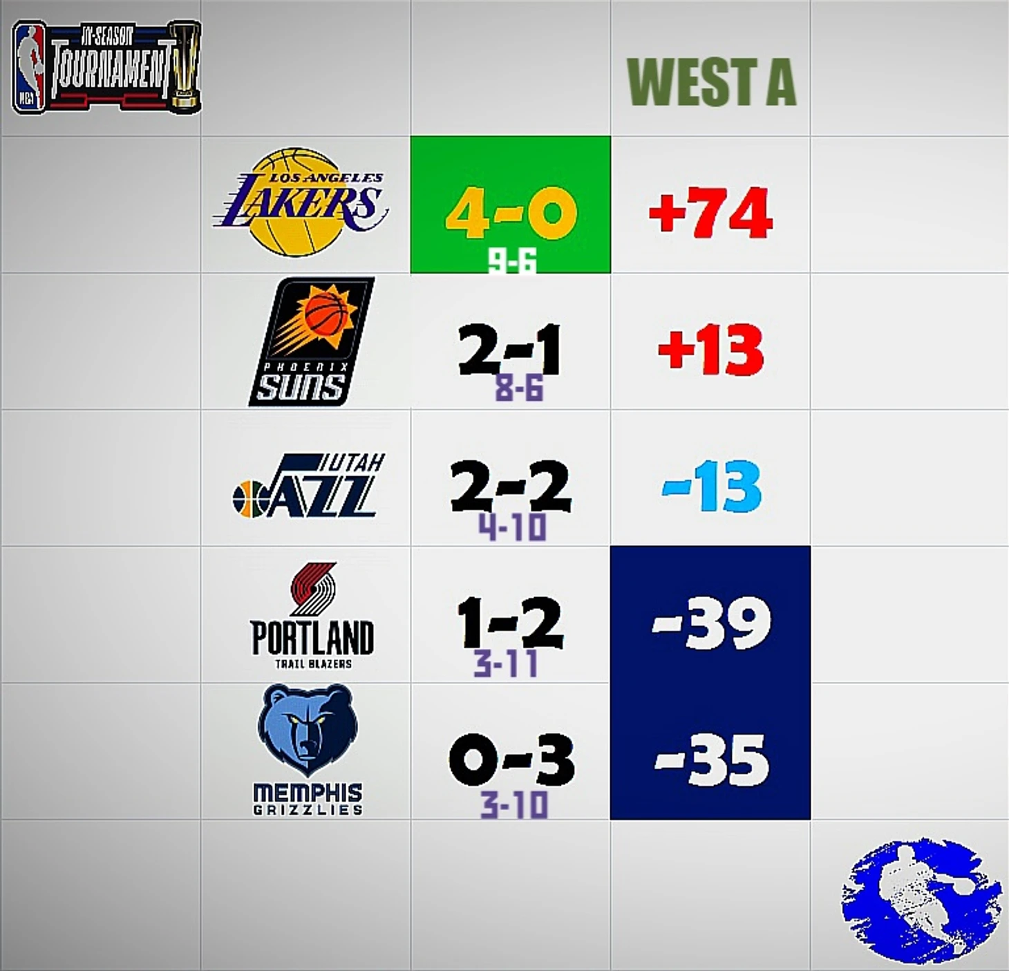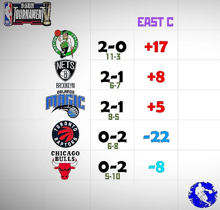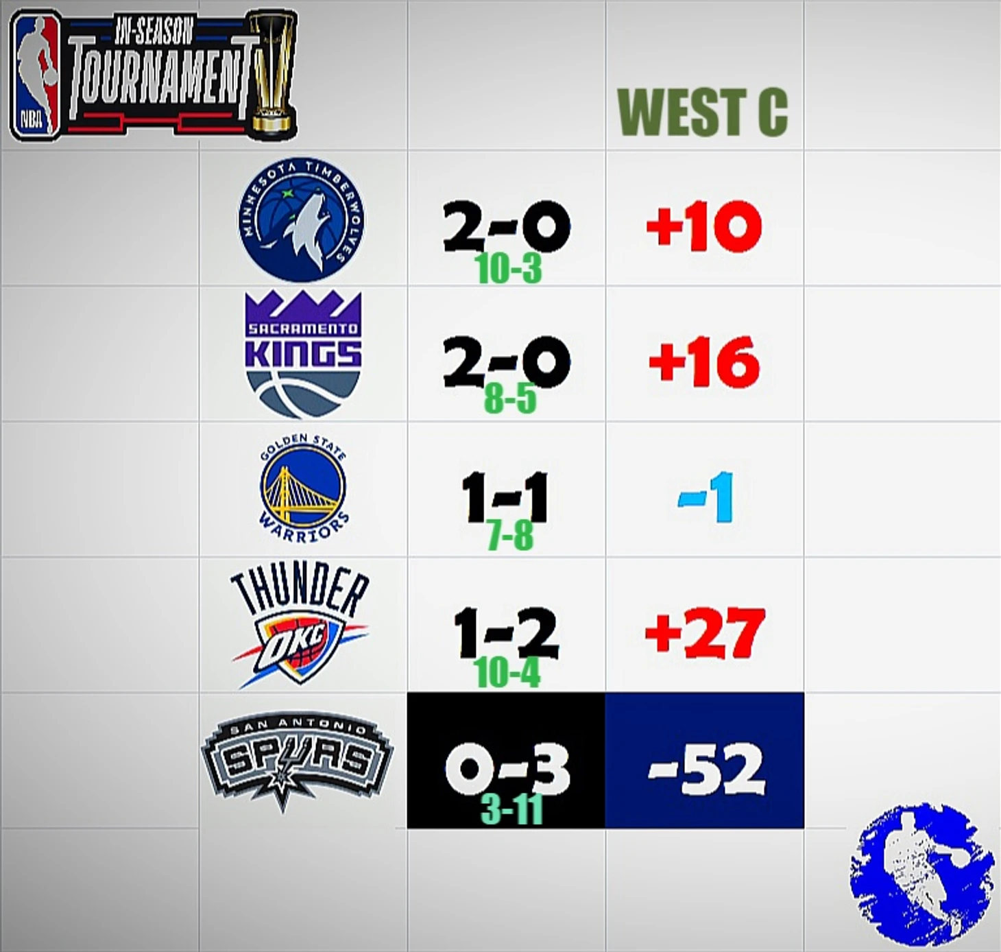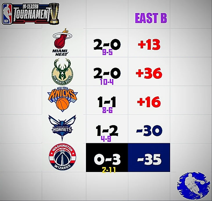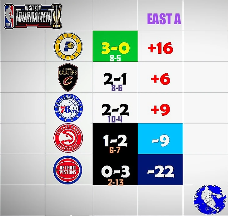 Так же напомню, что под результатом во внутрисезонном турнире, к примеру, Индианы (3-0) индекс снизу (8-5) - это их текущее соотношение побед и поражений в регулярке'2023/24, а [+16] - это дельта забитых-пропущенных Пейсерс в Кубке НБА
