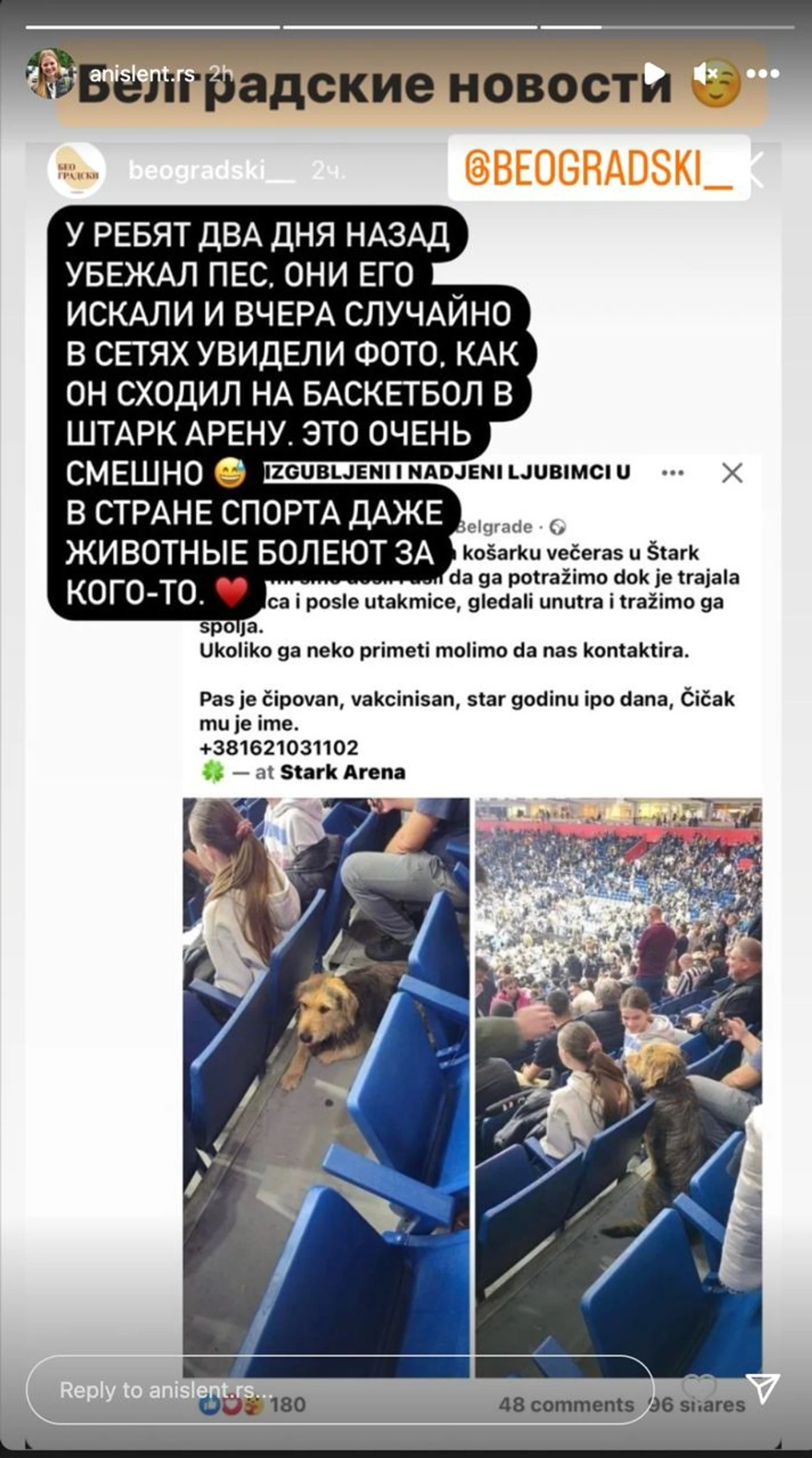 Собаку обнаружили на «Штарк Арене», когда «Партизан» играл с «Панатинаикосом» в Евролиге. Кто-то из болельщиков заглянул в фейсбук-группу, где выкладывают фото потерянных и найденных собак в Белграде. Пост уже убрали, хозяева забрали собаку.