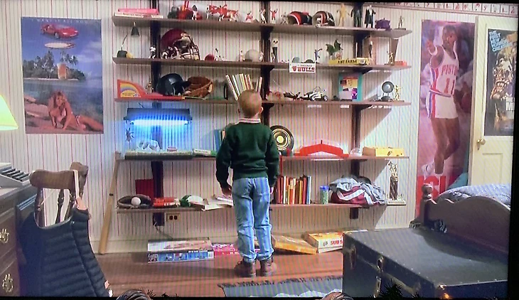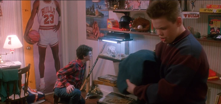 «Один дома» УЖАСНО нереалистичен. В комнате База в районе сезона-90/91 висит постер Айзейи Томаса и стикер «Чикаго»? Да что ж это такое. Ни один уважающий себя болельщик «Детройта» или «Чикаго» не стал бы такое делать. (Действие картины происходит в пригороде Чикаго, а потому там должен быть постер Эм Джея)».