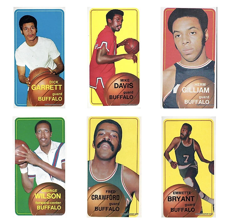 Здесь придется выкупать всю серию, поскольку набор карточек Topps, презентующий состав команды «Баффало Брэйвз» сезона-1970/1971 – одно сплошное недоразумение. Начать хотя бы с того, что у карточек нестандартная, вытянутая форма, из-за которой они больше походят на старорежимные автобусные талоны. Экспериментаторский подход обусловлен тем, что игроков снимали при помощи зеркала, чтобы вытянуть изображение и придать игрокам более лощеный и рельефный вид.