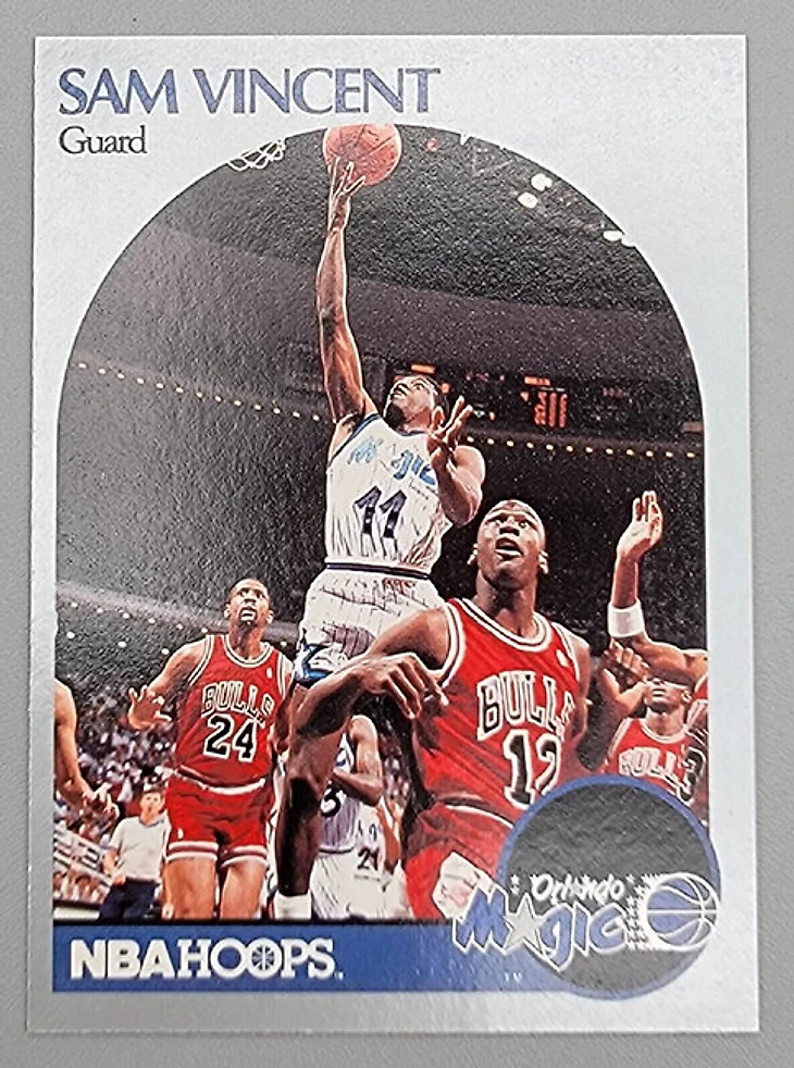 Не меньший интерес представляет и карточка Hoops Сэма Винсента сезона-1990/1991. Ну как Сэма Винсента. Разыгрывающий «Орландо» на ней тоже изображен, но куда больший интерес представляет игрок под 12-м номером.