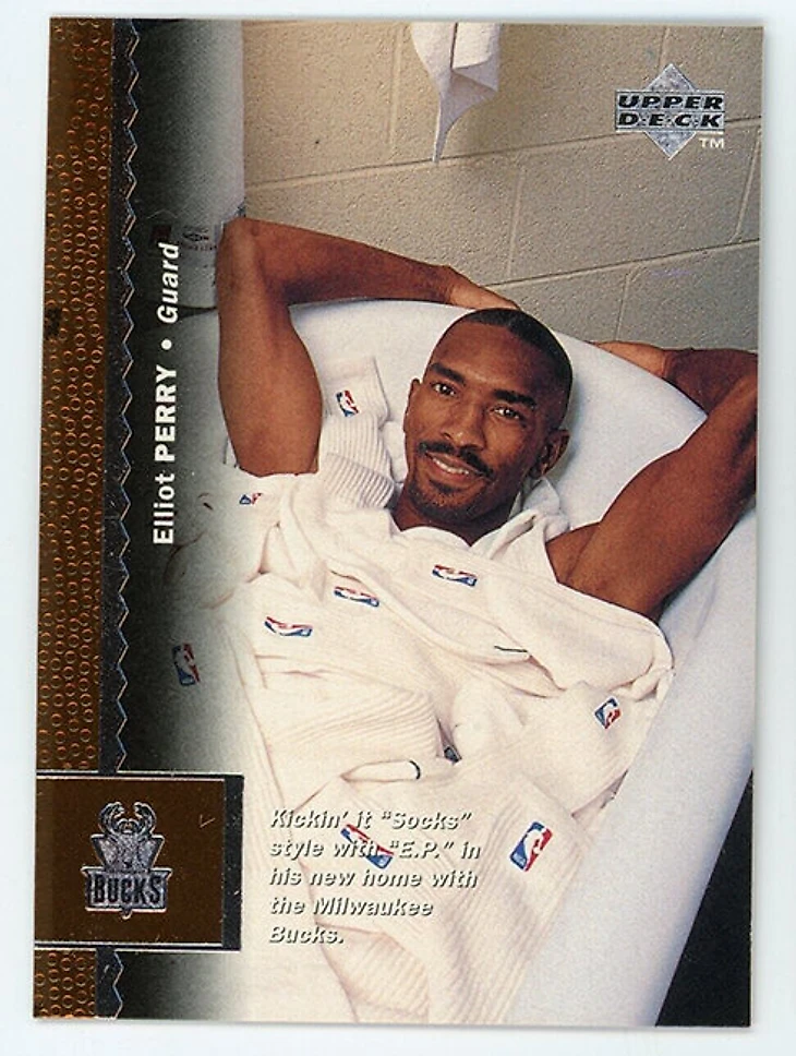 Подобных примеров можно было бы собрать еще с десяток, но ни один из них не переплюнул бы по степени гротеска карточку Upper Deck, изображающую защитника «Милуоки» Эллиота Перри в ванне, напичканной носками. И тут надо быть осторожным, чтобы не зайти в своих догадках слишком далеко. Все-таки этикет некоторых мероприятий с некоторых пор подразумевает носок как главный и единственный предмет одежды. Может, Перри просто зашел не в ту дверь?