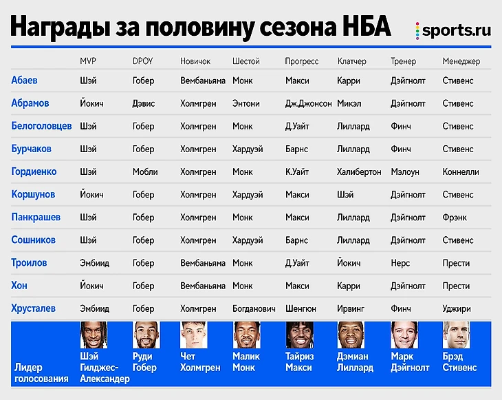 Абаев: Шэй Гилджес-Александер. Он дарит ощущение магии. Никто не мог поверить, что в лиге с праймовыми Йокичем, Эмбиидом, Яннисом и Дончичем разыгрывающий, не играющий от броска, сможет бороться за награду, а его молодая команда будет в лидерах конференции.
