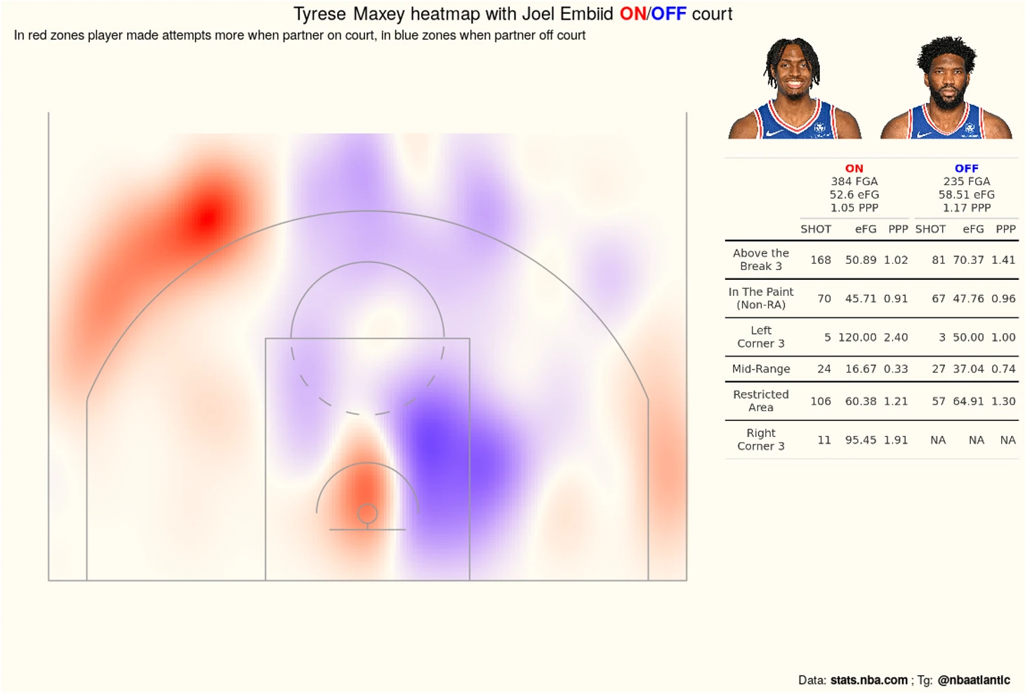 Основная разница в эффективности бросков Тайриза в зависимости от наличия Джоэля на площадке – это зона трехочкового напротив кольца («трешки в лоб»). 81 бросок – это достаточно малая выборка для оценки трехочковых, но 1.41 очка за владение выглядит круто. Гораздо лучше, чем 1.02 PPP из той же зоны, когда на площадке оба. Но вообще выбор бросков Тайриза не предполагает преимущества без Эмбиида, так как тогда он чаще атакует из «некачественных» средних зон. Жаль, что из-за травмы Эмбиида, скорее всего, в этом сезоне выборка этой пары уже не увеличится (так как для расчета берутся только те игры, в которых оба играли).