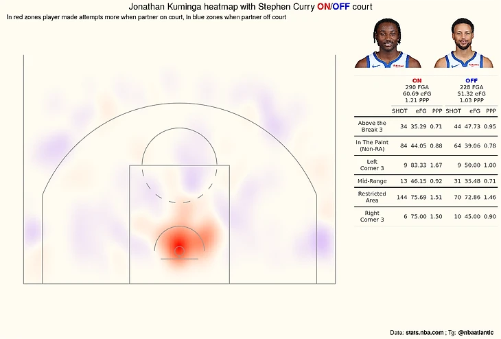 Ну и вот пара с самым большим влиянием партнера на выбор бросков. Карта бросков Куминги с Карри на площадке похожа на карту классического центрового (назовем ее «карта Руди Г.»). При этом без Стефа Джонатан гораздо более вариативен в выборе позиции. Но если смотреть на его эффективность, не сказать, что это хорошо. Из всех трех зон с большим количеством бросков он атакует примерно с одинаковой эффективностью вне зависимости от наличия Стефа на площадке, но доля этих бросков, когда Карри на скамейке, от одной хорошей зоны (под кольцом) перетекает в две зоны с эффективностью ниже одного очка за бросок (трешка в лоб и «краска» за пределами полукруга).