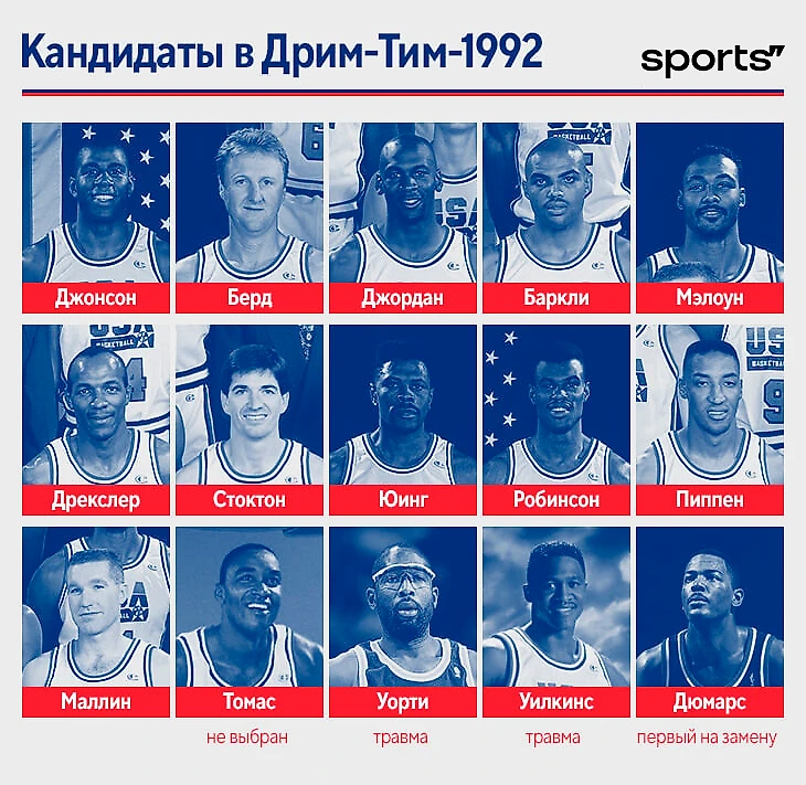 Из 11 игроков старта (Берд был травмирован, вместо него вышел Пиппен) Запада и Востока на МВЗ-1992 десять попали в сборную, одиннадцатым был Айзейя, вместо которого поехал Стоктон – лидер НБА по передачам уже пятый год подряд.