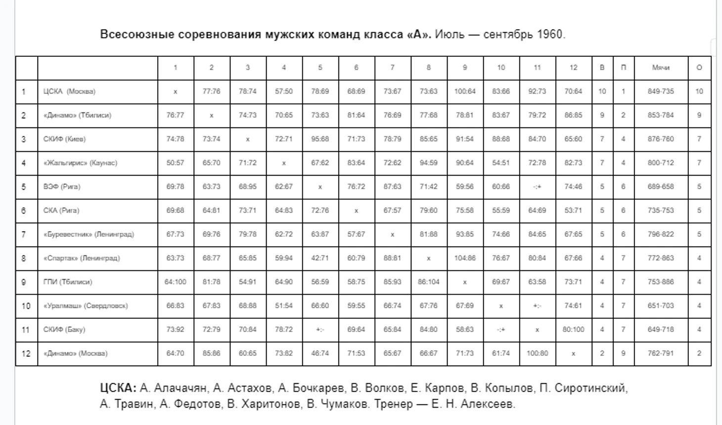 17 марта 1960. Ленинград. ЦСК МО – чемпион страны (слева направо): Аркадий Бочкарев, Арменак Алачачян, Анатолий Астахов, Владимир Копылов, Александр Травин, Михаил Семенов, Виктор Харитонов, Геннадий Вольнов, Евгений Карпов, Виктор Зубков. Главный тренер – Евгений Алексеев (нет на фото)