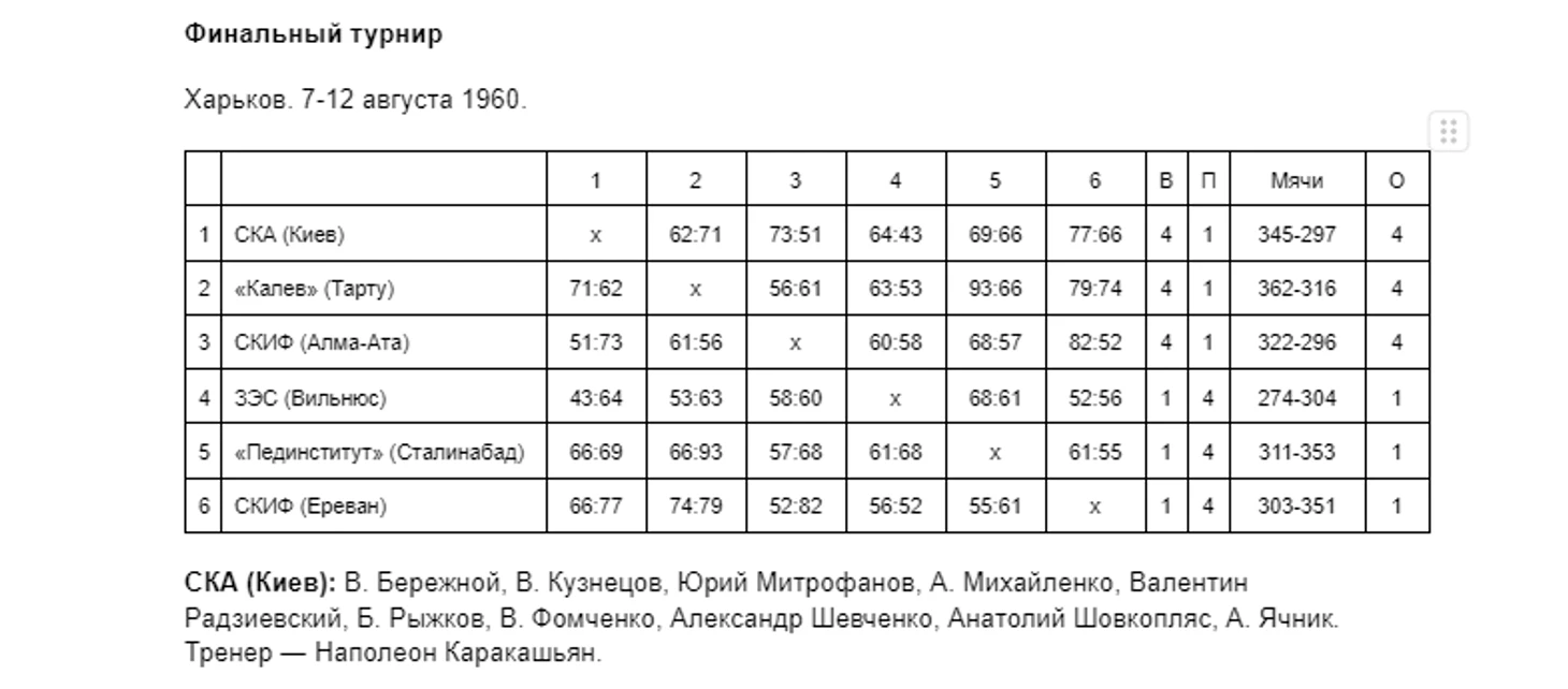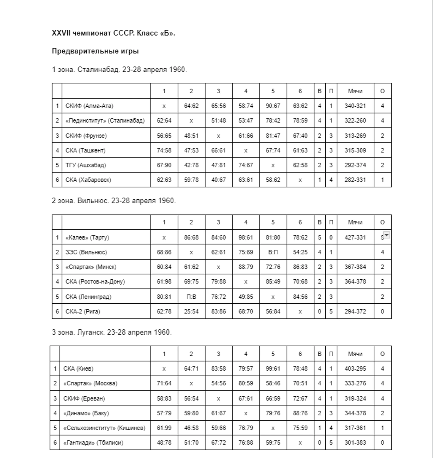 XVII летние Олимпийские игры. Рим. 26 августа – 10 сентября 1960 года. Предварительный раунд. Группа «С». 2. СССР: Мексика – 66:49, Бразилия – 54:58, Пуэрто-Рико – 100:63. +2-1. Полуфинальный раунд. Группа «В». 2. СССР: Уругвай – 89:53, Югославия – 88:61, США – 57:81. +2-1. Финальная группа. 2. СССР: Бразилия – 64:62, Италия – 78:70.