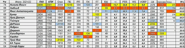 Суммарный коэффициент объема выполненной работы ПКК (пятикомпонентный комбайн= очки + подборы + ассисты + перехваты + блокшоты), не учитывающий отрицательные компоненты в игре даёт такое же распределение, как и итоговое голосование в тройке лидеров той гонки за эмвипи. И в ПКК остальные трудяги не отваливаются так далеко от группы Йокича.