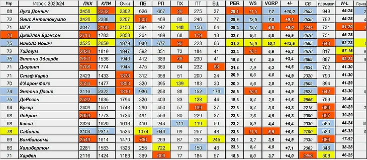 Пока это не результаты работы выборщиков, а последний рейтинг с официального сайта лиги, поэтому распределение сделаем по набранным очкам, а все остальные кэфы просто подсветим, чтобы было видно, кто и в чём лидирует в этом сезоне. Самый результативный в НБА - Дончич - только в последних двух рейтингах, которые лига выкладывает раз в неделю, поднялся на второе место. До этого вслед за Джокером там постоянно шли Шай и Янис. После Матча звезд Даллас показывает третий результат в лиге (16-7), лучше на этом отрезке только Бостон и Денвер. Но при доминировании в регулярке лидер кельтов Тэйтум снизил по сравнению со своим прошлым сезоном свою результативность и сейчас он лишь №6 в гонке бомбардиров. Прибавить в точности бросков и эффективности во всех компонентов Джейсон тоже не смог ни относительно себя прошлого, ни на фоне группы лучших, с которыми он соревнуется, поэтому и по КПИ, и по ПКК он на восьмых ролях.