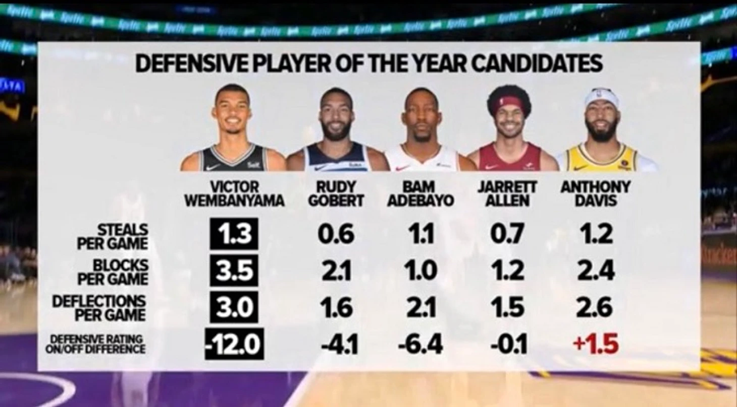 Руди удерживает процент реализации бросков соперников с расстояния 2 метров до кольца и ближе на отметке в 48,8% – самый низкий показатель среди всех игроков, против которых в среднем атакуют столько же, сколько через него (7,8 попыток в среднем за игру). Само присутствие француза на площадке дает «Миннесоте» преимущество. Когда Гобер на паркете, количество бросковых попыток вблизи кольца сокращается на 5%. Такое влияние на рисунок нападения соперника важно, и по этой причине награду отдадут Руди, а не Вембаньяме с его эффектными 7 блок-шотами в нескольких играх подряд. «Сперс» в среднем за матч получают в свое 119 очков (22-й результат в лиге).