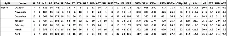 В плеймейкинге тоже все лучше, чем ожидалось – в сложном для себя позиционном нападении его итоговые цифры – это 11% всех пасов стали ассистами, по пасам, приводимым к очкам – показатель 14,5. У Д’Аарона Фокса, где система, наоборот, завязана под него, показатель 16,4. Но если мы взглянем условный апрель, февраль или январь, где под Скута было подбито большинство владений – в таком случае показатели: