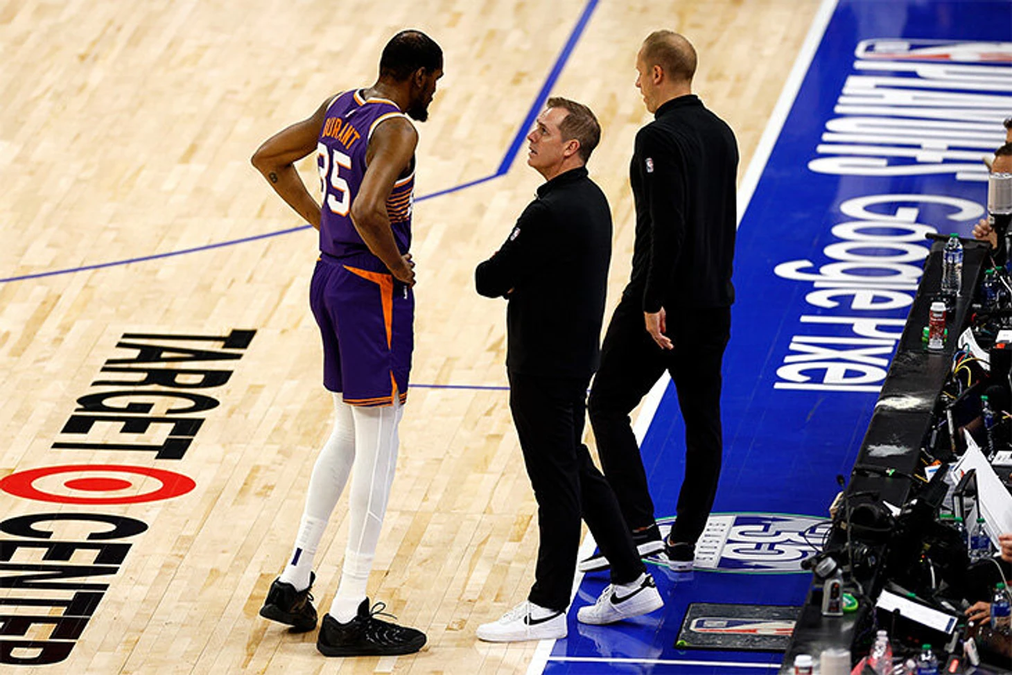 Второй – упрости задачу. Выпусти 5 игроков с броском, пусть все линии передач будут максимально читаемы, а поиск размена – предельно легким. Уже никуда не нужно утаскивать страхующего соперников – он и так на дуге. Это сносно работало в 4-м матче, у «Финикса» там был атакующий рейтинг 130, накидывать мог уже не только Дюрэнт, но и Букер.