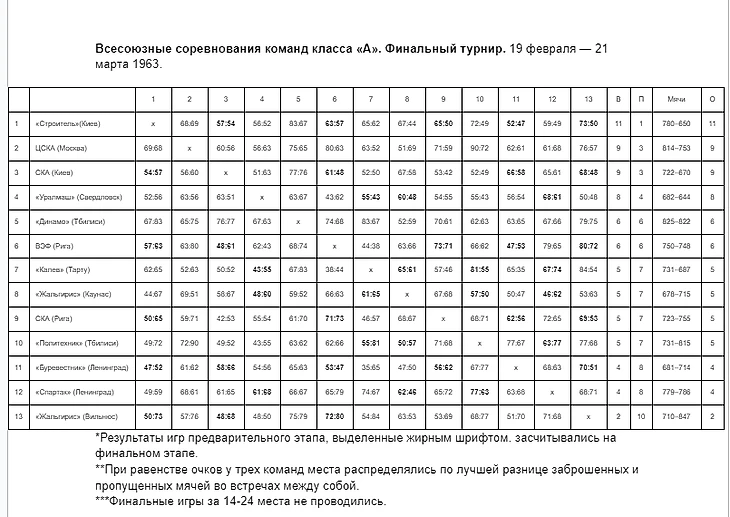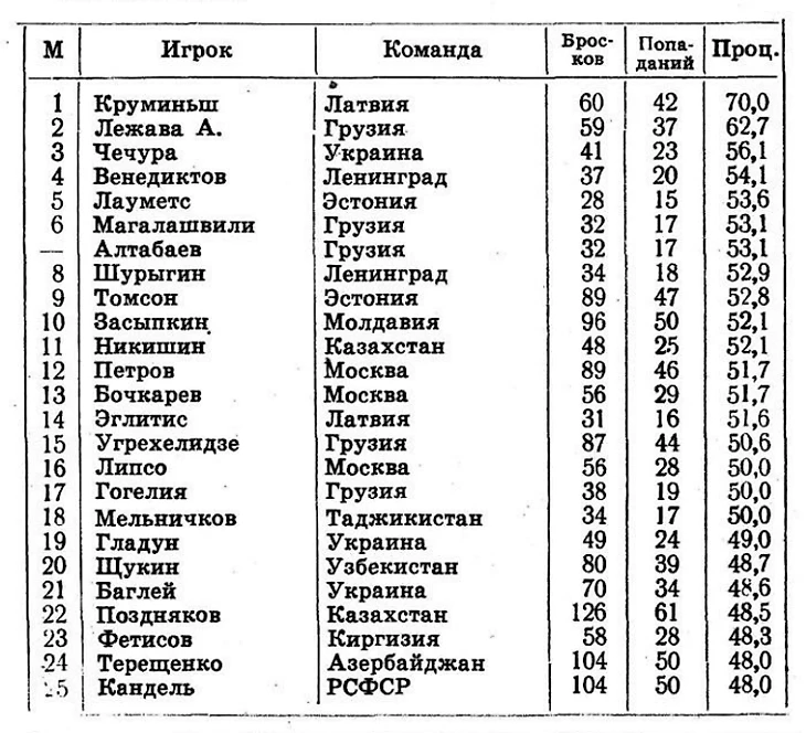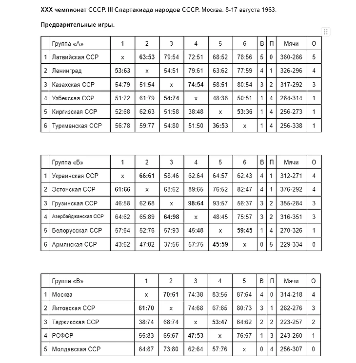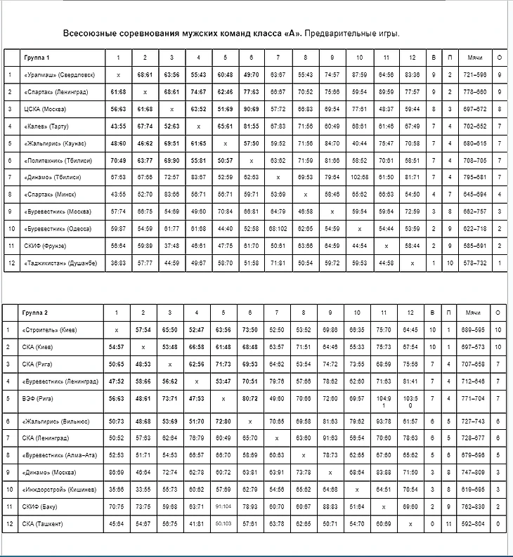 В группе «А» Латвия (рижские СКА и ВЭФ) без проблем обыграла пятерых соперников, в том числе Ленинград — 63:53, который в борьбе за второе место с огромным трудом в овертайме взял верх над Казахстаном — 54:51.