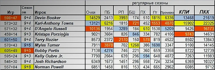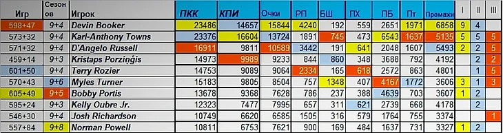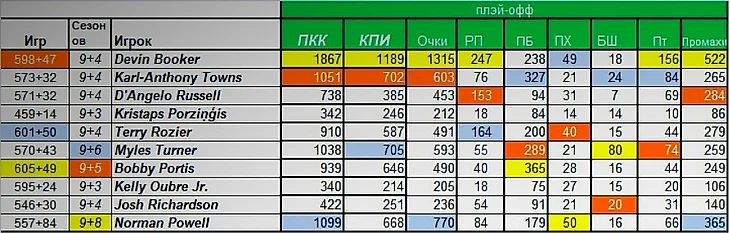 Если собрать весь пробег по ассоциации (регулярный сезон + плэй-офф), то в ПКК топ-3 возвращаются те же лица, что владели регулярным рейтингом, только Майлз Тернер обходит шлангующего пока в матчах навылет Порзиниса. Ну и суммарный КПИ продолжает намекать Букеру на более качественный стиль работы у Таунса, а также не дает ДиАнджело Расселу скинуть с пьедестала латыша. Он по прежнему качественнее преследователей, но дистанция Порзи от ДиЛо и Тернера совсем незначительная. Надо бы ее в июньском Финале Кристапсу нарастить.