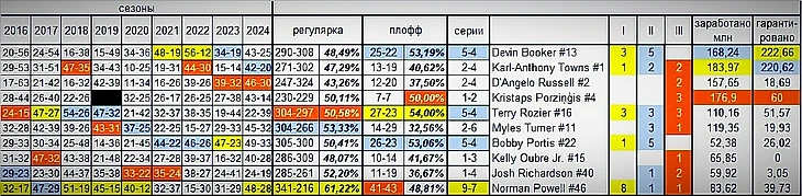 Букер с тех пор как познакомился поближе с Крисом Полом из плэй-офф без ачивок не уходит. Старый генерал показал Дэвину, как открывается эта дверь в апреле каждого года, теперь ДиБук таскает туда своих новых друзей...правда с каждым новым разом эти визиты становятся все короче. Но этого «феникса» из Финикса уже не остановить: люди ждут да и сам он жаждет: осталось подобрать несколько ключевых элементов в команду, самим не травмироваться, а там глядишь: и в Аризонской долине застрянет грузовик, перевозящий посылку от Ларри О’Брайена. Пока Букер опережает свой драфт-класс в суммарных пловных коэффициентах.