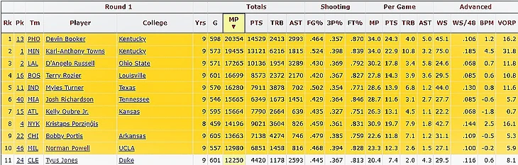 Как обычно: самый рабочий критерий для выбора лучших работников драфта – это «сыгранные минуты». Если отбирать топ-10 по количеству игр, то наверх выйдут откровенные ролевики, мало пропускавшие, но выходившие на небольшие по меркам топчиков минуты – они обычно важны и полезны, но цифровой вклад таких работяг значительно меньше. В драфте 2015 выборка по минутам (МР) в топ-10 дает те же лица, что и выборка по набранным очкам (РТS) с непринципиальными перестановками (это редко бывает, обычно парочка лидеров игрового времени вылетает в топ-12 из десятки). Единственная разница – в рейтинге по «очкам» на №11 поднимается Монтрез Харрел – лицо, достойное упоминания по его суммарному вкладу и по примеру, который на его шкуре лига преподает всем остальным игрокам.