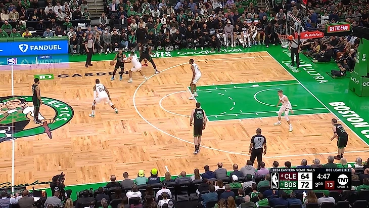 Я объясняю это тем, что Тейтум на момент броска соперников оказывается ближе к своему кольцу. То есть Тейтум в защите играет ближе к четвертому номеру, а Браун – ближе ко второму. Но если обратить внимание на моменты смены владений, то заметно, что Тейтум реже рвется вперед сломя голову. Для него это не приоритет — обогнать защиту с позиции глубоко под своим кольцом будет сложновато, да и силы лишний раз тратить не хочется.