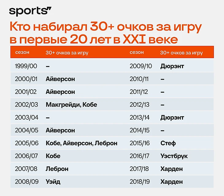 Ладно два сезона, бывают всякое. Но три подряд сезона на 30+ очков за матч от Хардена – это прямо историческая высота на одном уровне с Коби. Выше только Айверсон, да и тот не набирал 30+ трижды подряд.
