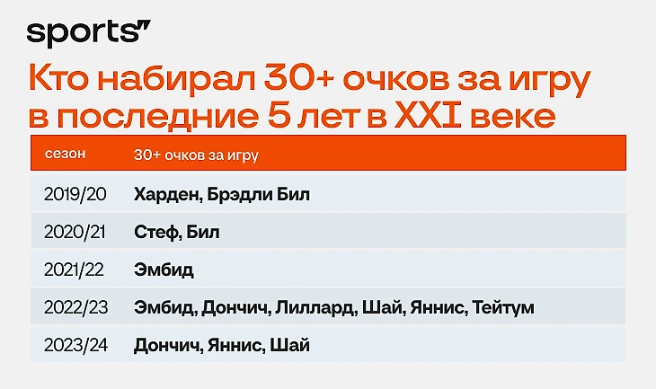 В сезоне-2023/24 больше 30 очков за игру набирали трое (Дончич, Яннис и Шай). И был лишь один другой случай в этом веке, когда 30+ очков покорялись сразу троим игрокам – в сезоне-2005/06 эту планку перешагнули Кобе Брайант, Аллен Айверсон и Леброн Джеймс. Но если убрать ограничение по матчам, то окажется, что 30-очковых снайперов в этом сезоне было четверо, поскольку Эмбид (34,7 очка) провел лишь 39 игр.