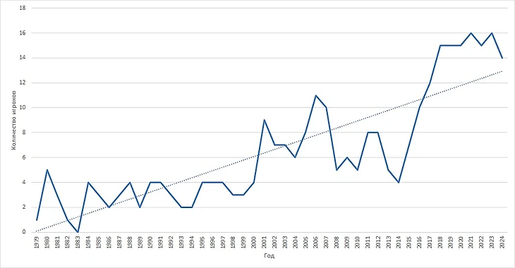 Возможно, перечисленные три товарища и тянут лигу в пучину единальства. Но я посчитал, сколько игроков НБА имели USG выше 30% в каждом сезоне с 1978 года. Вот что получилось:
