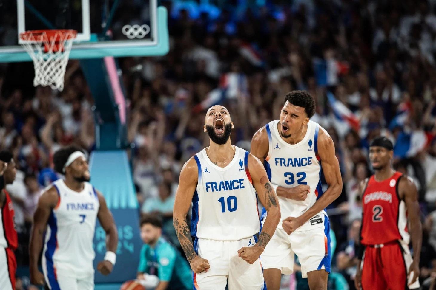 у Канады есть ровно одна проблема в атаке: слабый центровой, через которого идёт 0.01 атак за игру. При всём уважении к Пауэллу или в особенности канадской легенде Келли Олиннику (представляете, парень играет за Канаду даже в мусорных матчах в отборочных турнирах к Чемпионату Мира или во всяких североамериканских турнирах сборных), но они являются слабым звеном в старте. Идеальное решение для Канады было бы играть в смолл-болл, отправив на позицию пятого номера, например, Дилона Брукса и выпустив проваливающего турнир Джамала Мюррея в старт, надеясь на его воскрешение. Да вот только это невозможно против Франции с четырями центровыми в стартовом составе, двое из которых выше 215 сантиметров. Да и нет у Канады больше игроков достойного уровня на замену (спасибо, что хоть запасные как-то худо-бедно держатся с помощью Джамала). Поэтому у Канады на паркете всегда есть центровой (Пауэлл/Берч/Олинник). Потенциальное решение Франции: сделать так, чтобы центрового держал любой двухметровый конус на колёсиках, чтобы не тратить на центрового своих игроков.