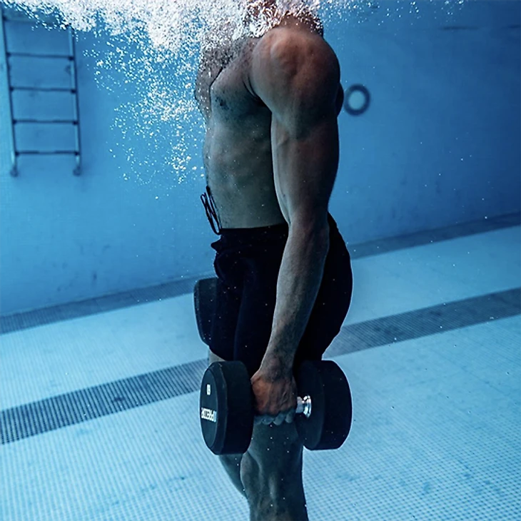 «Самое интересное, что комплекс, лежащий в основе Deep End Fitness, начинается за неделю до непосредственного погружения в бассейн. Семь дней ты занимаешь только на земле: зал, работа с весами, минимум кардио. Все для того, чтобы тело испытало стресс после изменения среды, к которой заново приходится приспосабливаться. Ты учишься не только по-другому дышать, твой мозг адаптируется к резкой смене условий. В зале ты работаешь в одном ритме – определенный вес, необходимое количество повторений. Здесь ты работаешь с мячом для кроссфита, затем делаешь несколько сетов отжиманий, после прыгаешь в бассейн, где работаешь на глубине с весами, а после проплываешь в интенсивном ритме, скажем, 300 метров. Все это на скорости.