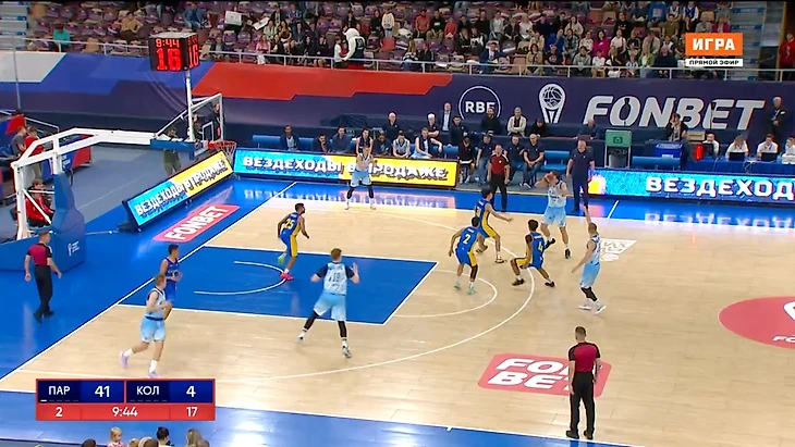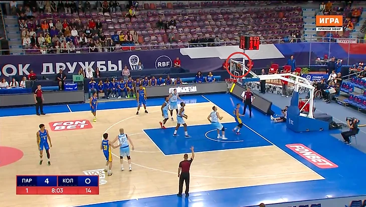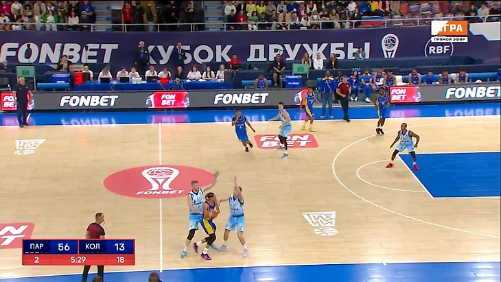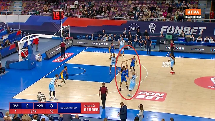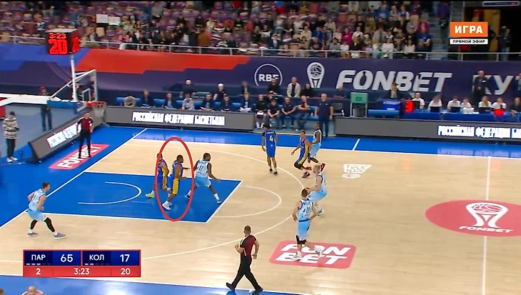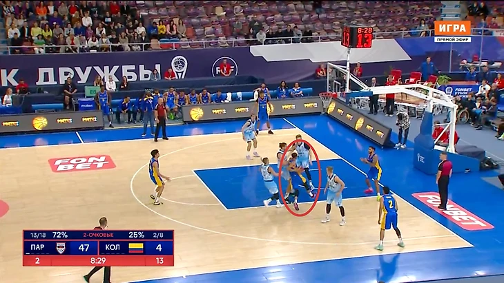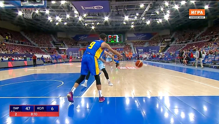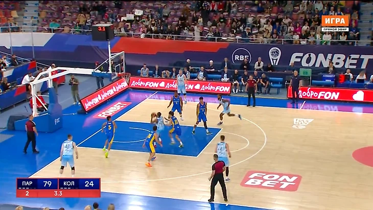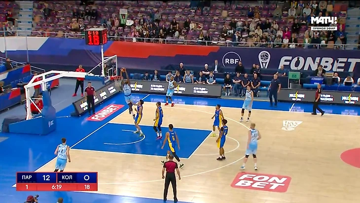 12. «Парма» играет не самый удачный пик-н-ролл, но Колумбия сталкивается с такой баскетбольной комбинацией в первый раз в жизни и пугается так, что Дмитрий Халтурин получает мяч в одиночестве под кольцом.
