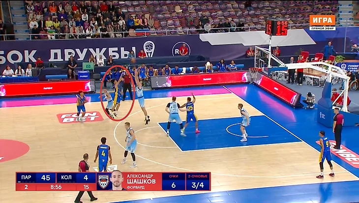 15. Хулиан Васкес мгновенно отвечает на атаку Шашкова, его визави по позиции, трехочковым, который почему-то исполняется в технике флотера.