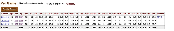 Он, очевидно, пока максимально спорно соответствует требованиям 1-го пика и по PER его показатель 12,5, а это очевидно не самая лучшая родословная – Первис Эллисон, Кеньон Мартин, Оловоканди, Кваме Браун, прости господи, Энтони Беннетт… У всех нормальных первых пиков исторически этот показатель после трех сезонов – больше или равен 15. А при USG% более 30% Stathead определил эффективность Кейда как одну из худших вообще в НБА – 10,5. Даже у Бена Гордона в сезоне новичка этот показатель равнялся 14,9, как у 37-летнего Кобе Брайанта.