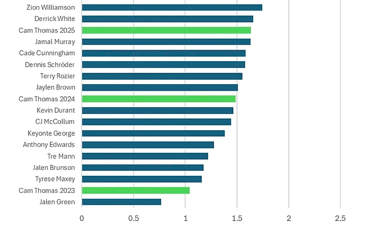 Кэм Томас продолжает учиться играть в правильный баскетбол, улучшает защитную игру, но при этом все еще попадает сумасшедшие броски. Если динамика продолжится, Томасу выпишут вполне оправданный и солидный грузовик, что солидно для 27го пика из LSU. Кэм абсолютно точно менее атлетичный Митчел с высоченным броском и умением попадать из сложнейших ситуаций.