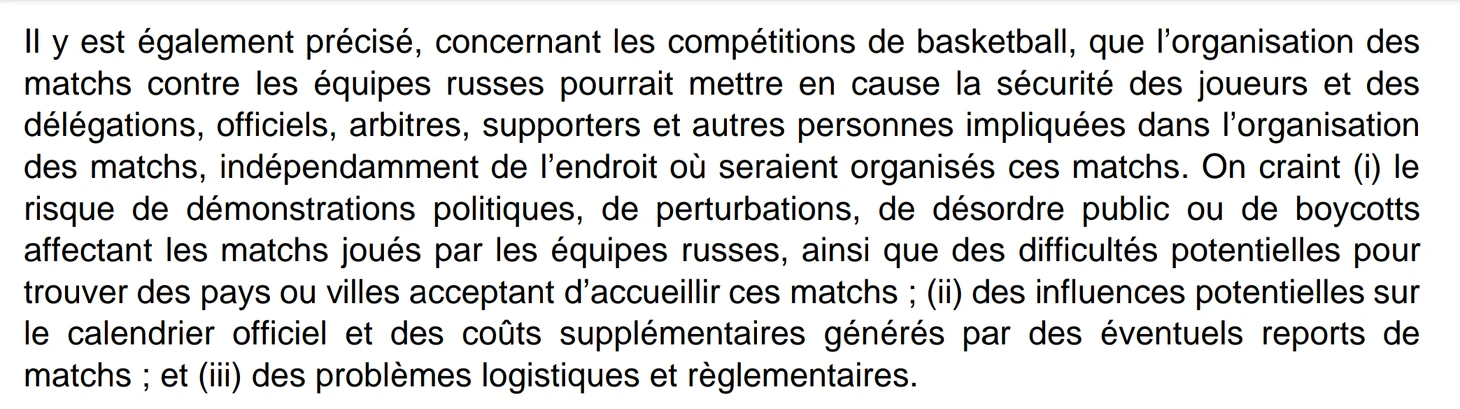 Но даже риск потерять сделку на 1 млрд евро не заставит Евролигу пойти на такой компромисс с ЦСКА. Само отстранение ЦСКА было законным и по конкретным причинам. Такое решение вынес люксембургский суд по иску российского клуба к Евролиге. В тексте решения говорится, ЦСКА не может участвовать в Евролиге из-за вопросов к безопасности, опасений в провокациях, из-за того, что в Москву мало прямых авирейсов и тяжело летать (несмотря на прямое сообщение из Турции и Сербии) и еще из-за того, что некоторые европейские страны ограничивают въезд по российскому паспорту (предположим, что это Литва и игра с «Жальгирисом»).