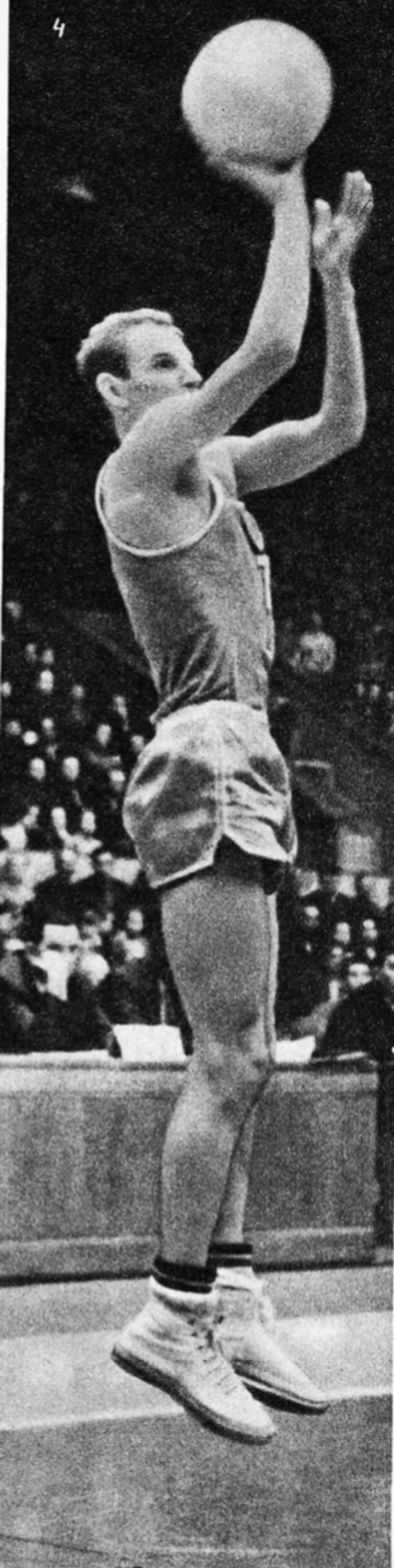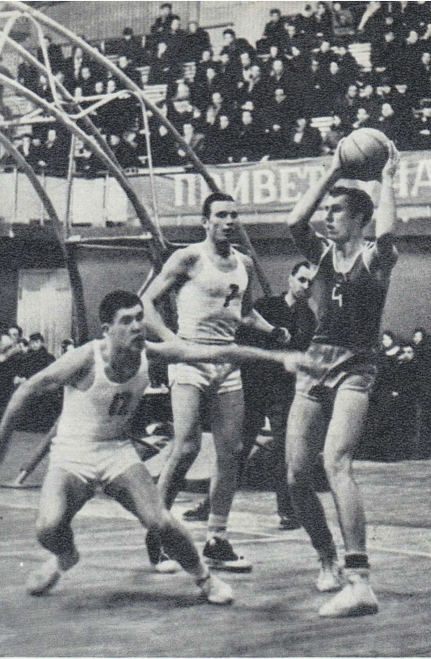 7 февраля. Каунас. Матч IV Всесоюзных соревнований команд класса «А» сборная СССР – «Жальгирис» – 77:56. Игрок сборной Ромуальдас Вензбергас (с мячом) против одноклубников Витаутаса Сарпалюса (№ 12) и Альгимантаса Жукаускаса
