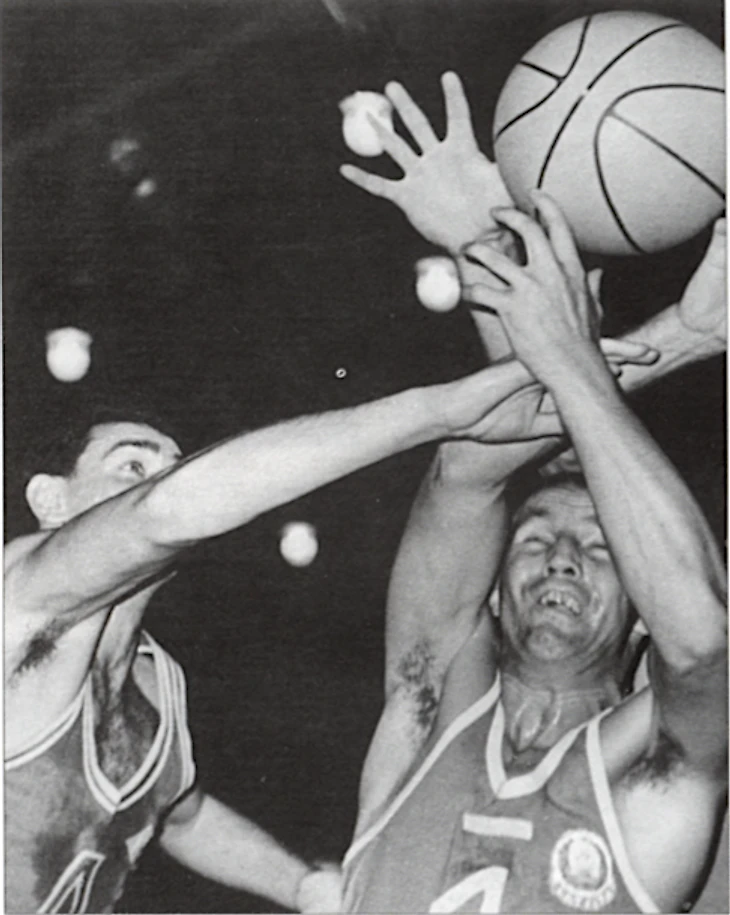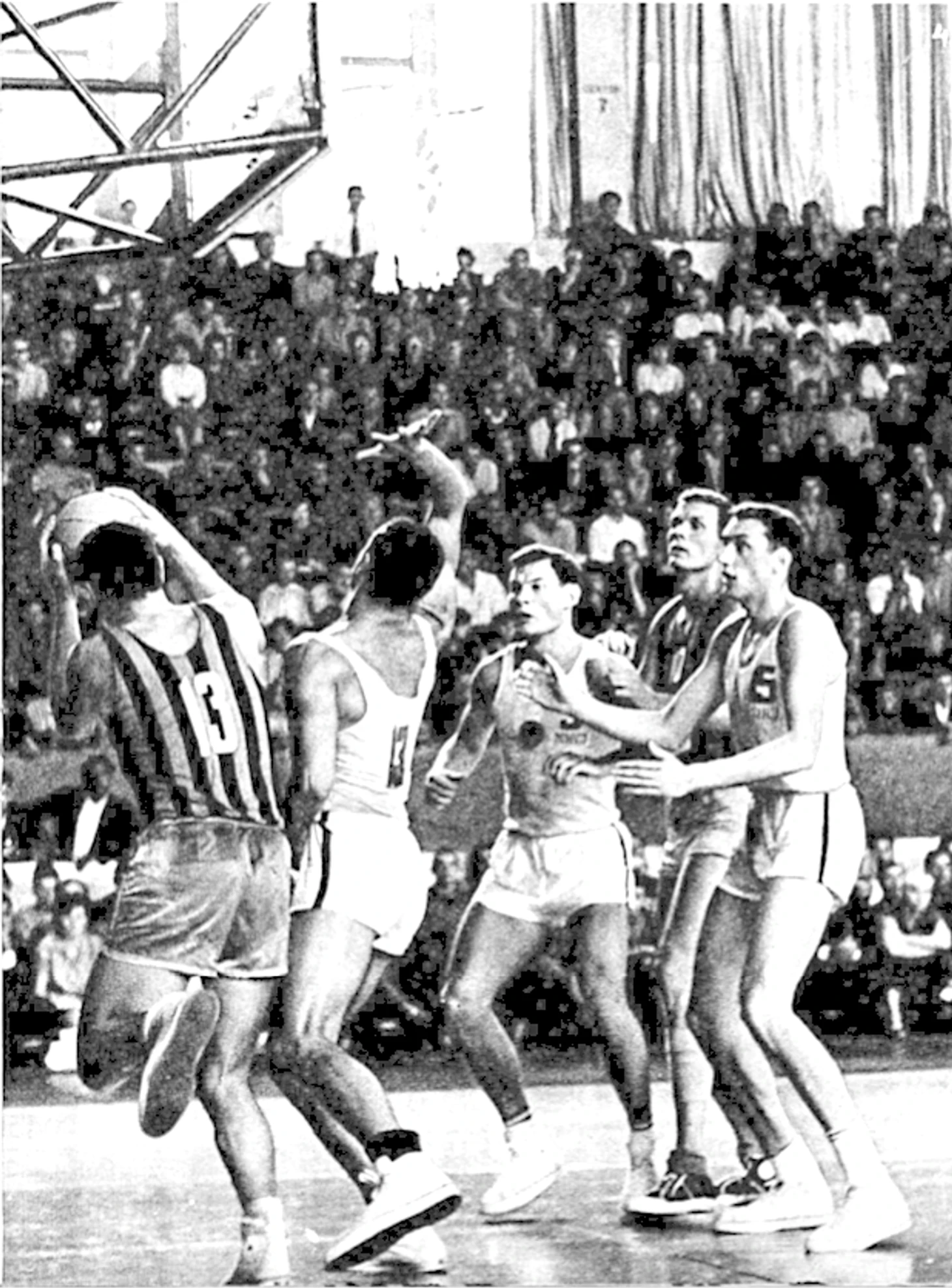 22 июля. Москва. Матч финальной группы IV Спартакиады народов СССР-1967 Москва – Латвия – 56:50. В борьбе за мяч Олег Бородин и Валдис Муйжниекс
