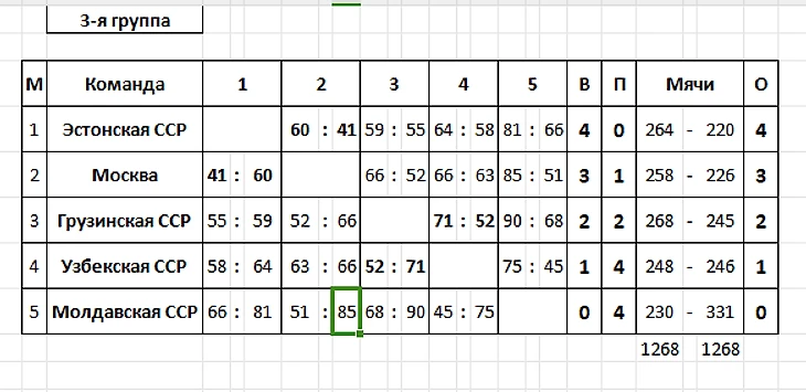В «Группе 3» (из 5 команд), как выяснилось, аутсайдер был только один – Молдавия. Узбекистан (1–3), в составе которого зажглась ярчайшая звезда – Алжан Жармухамедов (206 см), будущий «туркестанский змей», на равных сражался и с Эстонией – 58:64, и с Москвой – 63:66. Несколько неожиданно Эстония (4–0) выиграла у Москвы – 60:41 после того, как в первый тайм завершился со счетом 21:21. В составе москвичей было шесть (!) чемпионов мира, но играли они совсем не по-чемпионски. На следующий день, чтобы не зависеть от исхода матча грузин с эстонцами, Москве (3–1) надо было побеждать Грузию с разностью в 20 очков. Выиграла только 14 (66:52), в основном из-за странного судейства. К концу матча за пять фолов площадку покинули аж семеро армейцев – Алачачян, Вольнов, Травин, Андреев, Нестеров, Капранов, Селихов… В последний день групповых турниров Грузия (2–2) пыталась выиграть необходимые 10 очков у Эстонии, но, несмотря на усилия двух центровых – Коваленко и Лежава, уступила – 55:59.