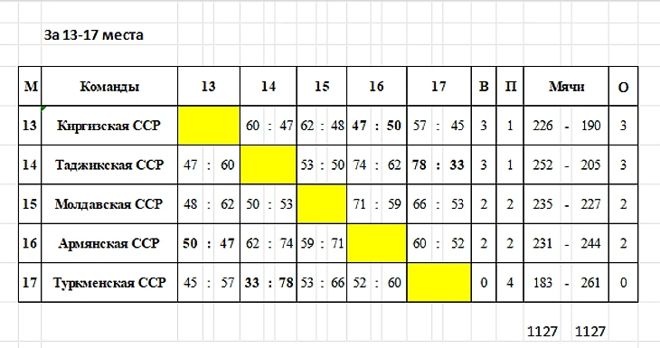 В Киеве (то ли игровые взаимодействия наладились, то ли соперники были послабее) сборная страны побеждала еще увереннее: АзИНХ (+43), киевский СКА (+36), «Буревестник» (+24), «Уралмаш» (+42), тбилисское «Динамо» (+47), наконец, «Строитель» (+25).