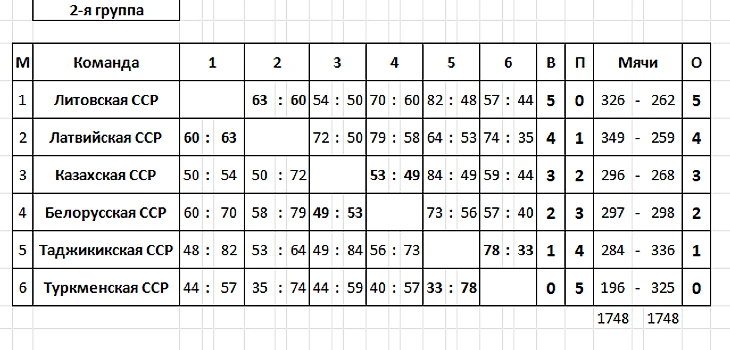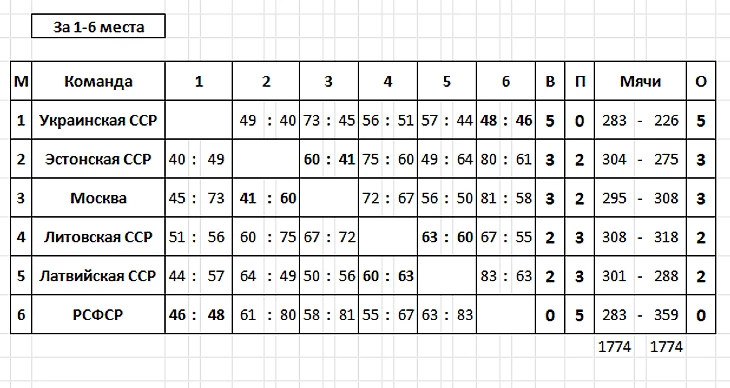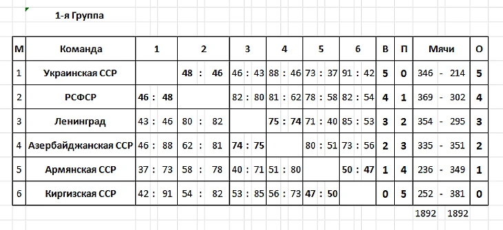 В «Группе 1», если судить по таблице, команды сыграли согласно ранжиру: все, кто выше победили тех, кто ниже. Но очень непросто. Украина (5–0), собрав сильнейший состав из баскетболистов «Строителя», а также армейцев Киева и Одессы, выиграла у России всего два очка (48:46), у Ленинграда — всего три (46:43). А россияне (4–1), ведомые 32-летним Канделем, новоявленным чемпионом мира Беловым, талантливыми Болошевым и Никитиным, обыграли в открытом баскетболе ленинградцев – 82:80, отправив соперника бороться за 7-12-е места.