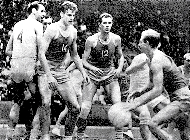 20 июля. Москва. Матч финального турнира IV Спартакиады народов СССР-1967 Украина – Литва – 56:51. Слева направо: Анатолий Поливода, Гедиминас Будникас, Модестас Паулаускас, Василий Окипняк, Ромуальдас Вензбергас. После этой победы Украина возглавила турнирную таблицу