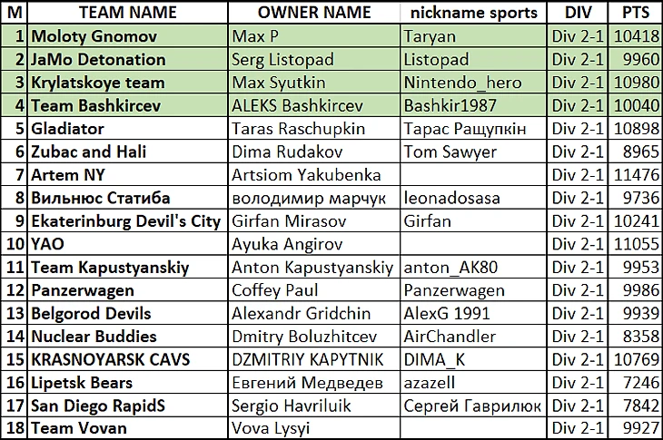 Из лиг Дивизионов 2-1, 2-2, 2-3 в Дивизион 1 поднимаются по 4 лучших команды