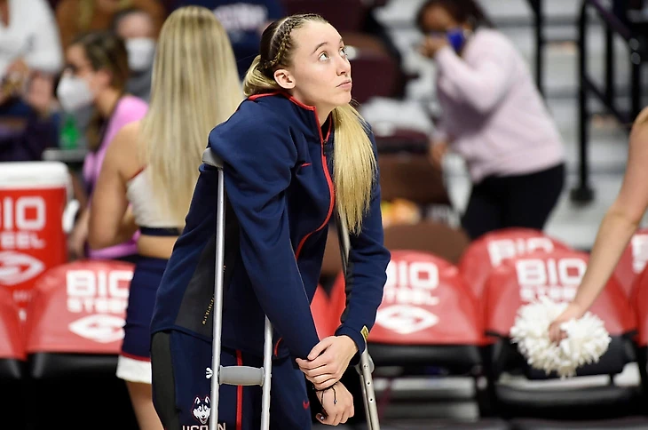 Бьюкерс попала в программу, имея за плечами множество наград, приличную статистику и первый номер рейтинга школьниц-баскетболисток. Естественно, от нее ожидали еще большего прогресса и максимальной помощи команде. Это и произошло. Она проведет отличный дебютный сезон в NCAA, в том числе в трех играх подряд выдаст 30+ очков, причем одна из тех игр будет против Южной Каролины – фаворита турнира и будущего многократного чемпионат NCAA. Пэйдж приводит «Юконн» в «Финал четырех», где, к сожалению, команда оступается и наша героиня остается без титула в свой дебютный сезон. Вместе с тем, первый год станет прекрасным стартовым толчком в студенческой карьере: 20.0 очков, 4.9 подбора, 5.7 передачи, 2.3 перехвата, при реализации в 52% всех бросков и 46% из-за дуги принесут Бьюкерс еще кучу разнообразных наград: Игрок года 2021, награды Нейсмита, Джона Вудена, Национальную премию Новичка года, Игрок года в конференции Big East, а также участие во всевозможных символических сборных по итогам сезона и венец – победа в главной спортивной премии США – ESPY, как лучшей студентки года. Первый звонок Как бы банально это не звучало, но за подъемом часто идет спад и виной тому как обычные жизненные проблемы и кризисы, так и столь нелюбимые для игроков травмы. Если в школьную карьеру они почти не беспокоили Пэйдж, то второй год в NCAA стал небольшим превью к тому, что будет ожидать ее в будущем. После окончания сезона 2020/21 она перенесла операцию на лодыжке по устранению дефекта костно-хрящевой ткани. В последующее межсезонье восстанавливалась и постепенно набирала форму. В итоге, к старту сезона Пэйдж была в полном порядке и в первой же игре установила свой новый карьер-хай в NCAA – 34 очка, не допустив при этом ни одной потери. «Спасибо девочкам в команде. Они просто давали мне мяч, а я знала, что нужно попадать, я попала в ритм», – скажет она после той игры. В декабре 2021 случился первый неприятный момент в ее университетской карьере – в уже выигранном матче, за несколько секунд до конца игры, практически на ровном месте, она травмировала левое колено. Упав на паркет и с трудом поднимаясь с помощью подруг по команде, ее увели на скамейку запасных. Обследование показало небольшой перелом берцовой кости и разрыв мениска. Все это заставило Бьюкерс остаться вне игровой площадки на 8 недель. Это время не прошло даром, она стала настоящим двигателем команды, заряжая ее со скамейки. Иногда казалось, что Бьюкерс просто бросит костыли и побежит помогать пятерке игроков на площадке.