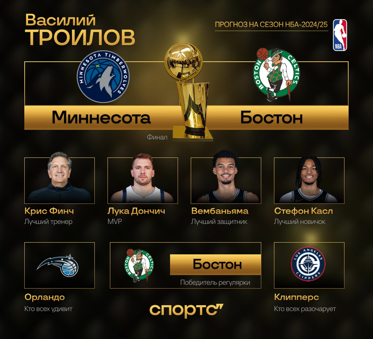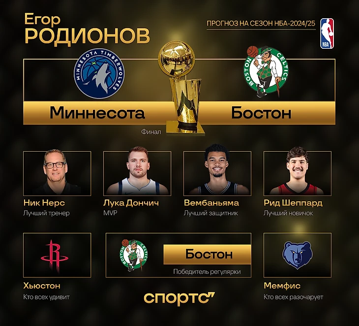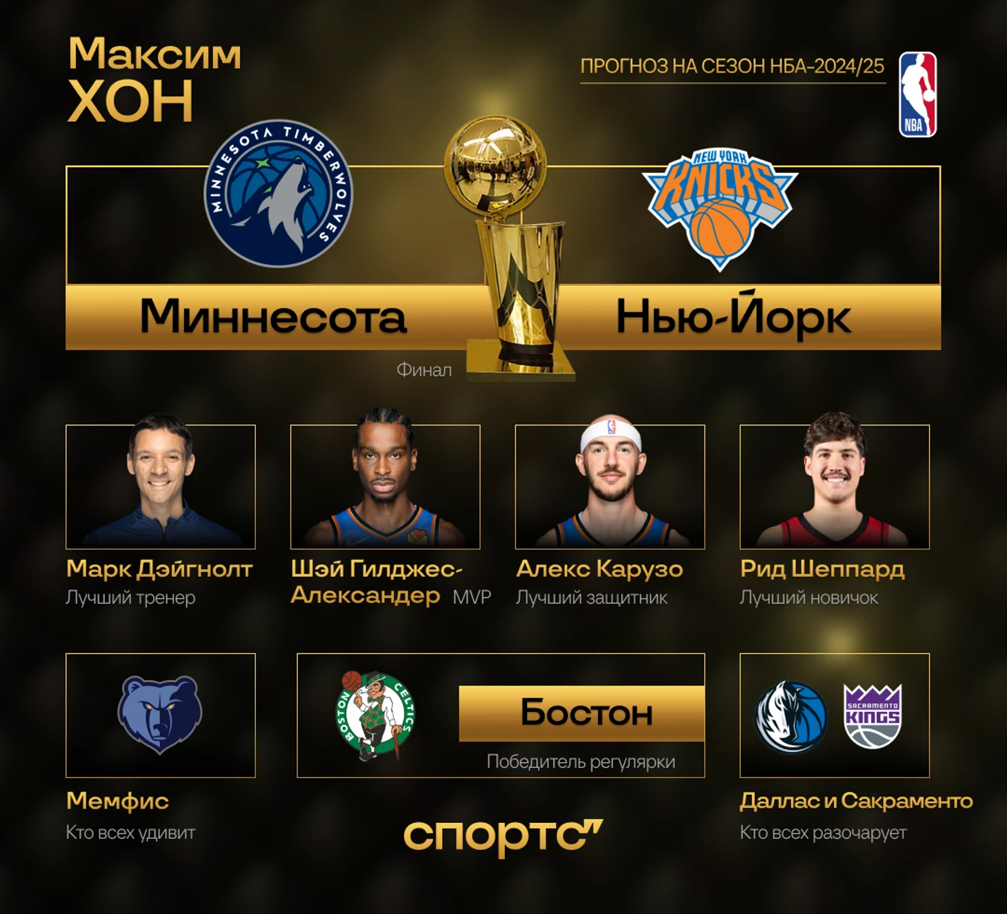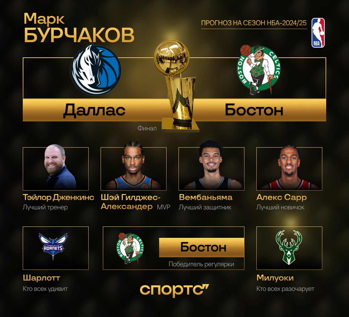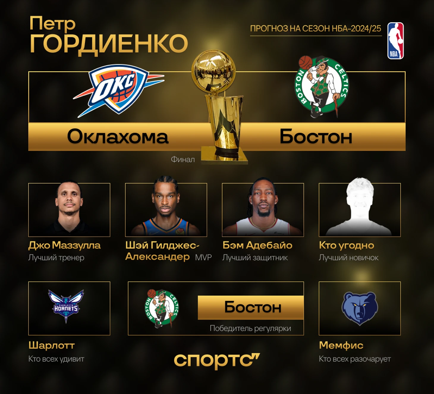 Жду по-настоящему конкурентного сезона. Да, есть явный фаворит в лице «Бостона», но остальные команды находятся не так уж далеко. Даже «Селтикс» будет непросто, особенно с учетом того, что, как любит говорить Маззулла, они играют «с прицелом на спине». На Востоке им будут противостоять полностью обновленная «Филадельфия», усиленный «Нью-Йорк» и «вечно молодые» «Милуоки». К этому добавляются серьезные соперники в лице «Кливленда», «Индианы», «Орландо» и «Майами», что означает, что уже в первом раунде придётся выкладываться на полную.