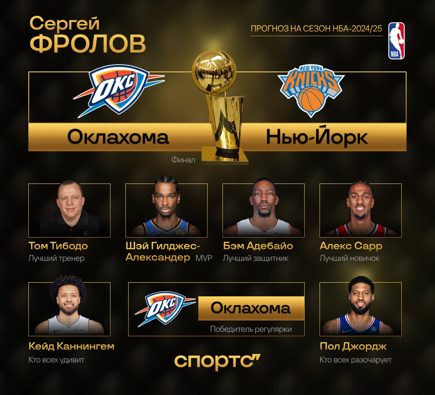 В новом сезоне я готов поверить в молодую, но прекрасно сбалансированную «Оклахому». Точечные усиления в лице Карузо и Хартенштайна в сочетании с прогрессом Холмгрена, Уильямса и молодых игроков скамейки делают их фаворитом Запада.