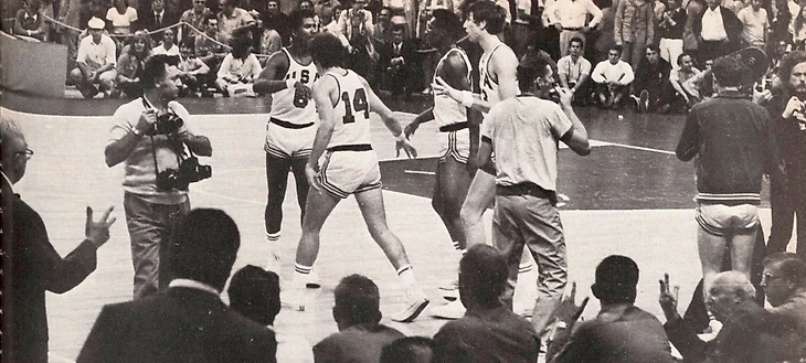 1. Преждевременная радость американской команды. Сразу два судьи за столиком (не только генсек ФИБА Уильям Джонс) показывают три пальца – играть еще три секунды