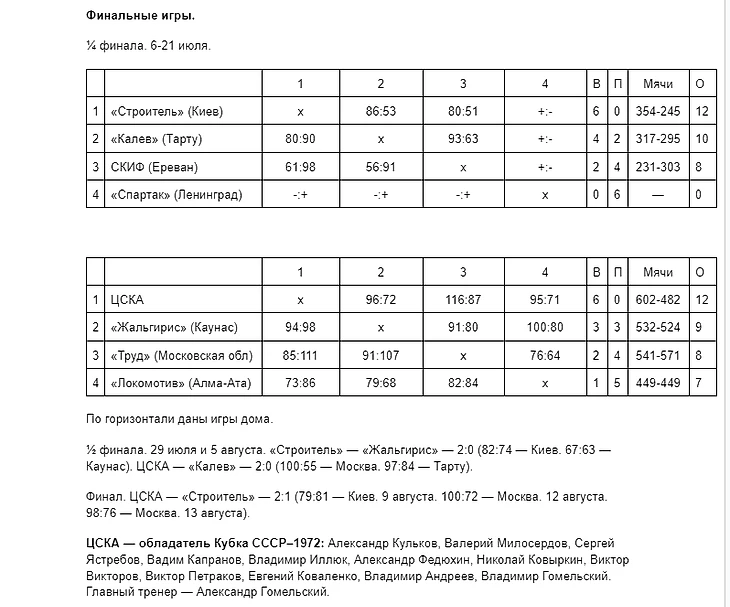 ХХ Олимпийские игры. Мюнхен. 27 августа – 9 сентября 1972. Группа «В». 1. СССР: Сенегал – 94:52, ФРГ – 87:63, Италия – 79:66, Польша – 94:64, Пуэрто-Рико – 100:87, Филиппины – 111:80, Югославия – 74:67. +7-0. 1/2 финала: Куба – 67:61. Финал: США – 51:50.