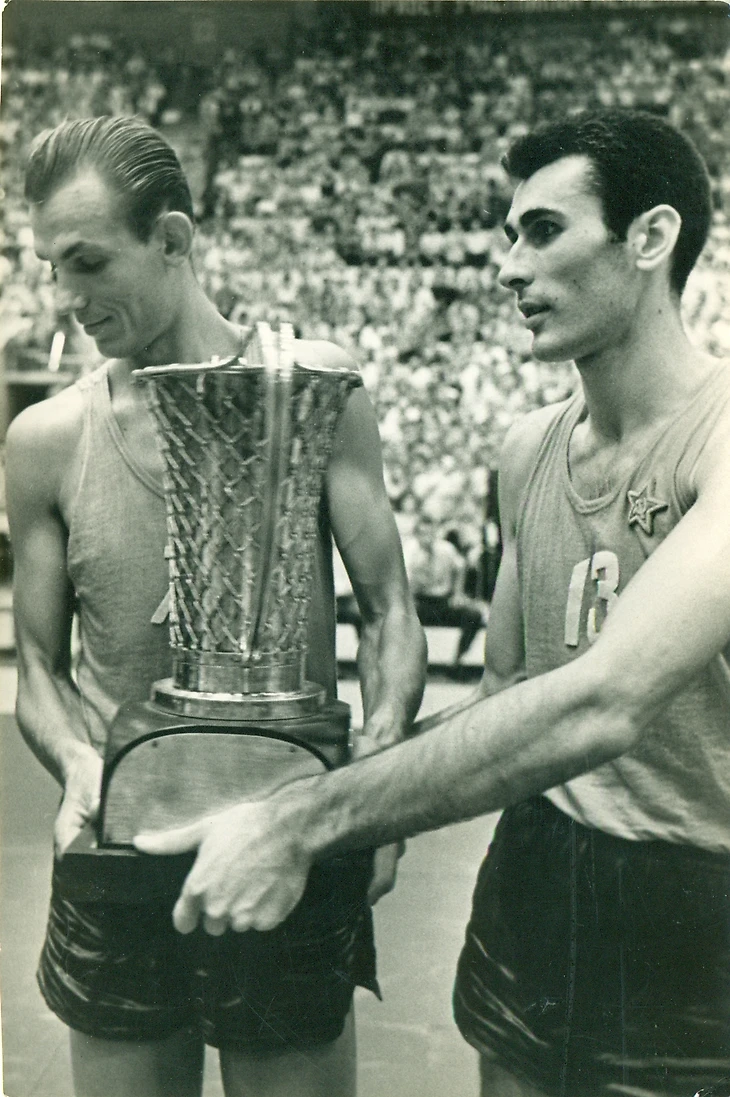 1 августа 1963. Москва. Дворец спорта. Только что ЦСКА нанес поражение в третьей игре финала Кубка чемпионов мадридскому «Реалу» – 99:80. С «Серебряной корзиной» Виктор Зубков и герой матча (26 очков) Геннадий Вольнов (№ 13)