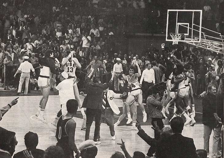 9 апреля 1972 года в Вильнюсе, в последний день чемпионата СССР, форвард «Динамо» (Тбилиси) Михаил Коркия, набрав 52 очка (новый рекорд первенств страны), помог своей команде обыграть «Строитель» (Киев) – 123:96 и занять четвертое место. 9 сентября 1972 года в Мюнхене, в финале Олимпиады, Михаил Коркия, выключив из игры лучшего центрового соперников, помог сборной СССР обыграть США – 51:50 и стать олимпийским чемпионом. На фото: Коркия мчится в атаку, опережая Джеймса Форбса (№ 10). Рядом Иван Едешко и арбитр Артеник Арабаджан