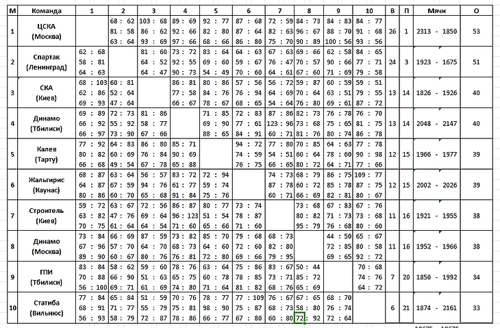 ЦСКА – 17–1 (второй круг – 9-0), «Спартак» – 17-1 (8-1), «Строитель» – 9-9 (4-5), СКА К – 8-10 (5-4, в том числе 5 побед подряд), «Динамо» Тб – 8-10 (4-5), «Калев» – 8-10 (3-6), «Жальгирис» – 7-11 (3-6, в том числе 5 поражений подряд), «Динамо» М – 7-11 (2-7), ГПИ – 5-13 (3-6), «Статиба» – 4-14 (4-5).