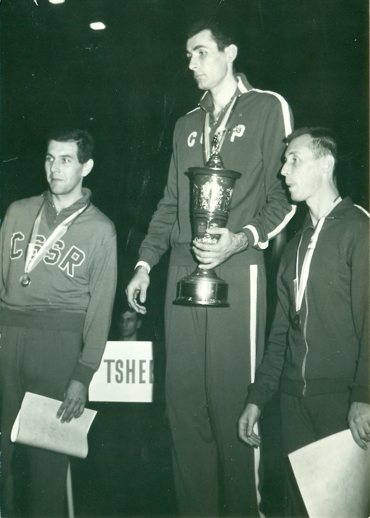 8 октября 1967. Хельсинки. Пьедестал почета чемпионата Европы. Капитаны команд-призеров (слева направо): Франтишек Конвичка (Чехословакия) – второе место, Геннадий Вольнов (СССР) – первое место, Мечислав Лопатка (Польша) – третье место