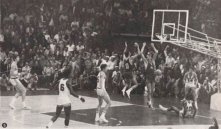 3. В воздухе Сергей Белов (№ 10), Александр Белов (№ 14) и «золотой» мяч, только что заброшенный в американское кольцо